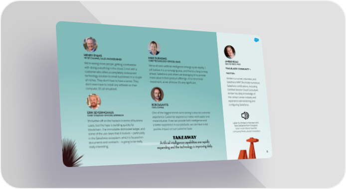 HENRY EVANS MIKE DUENSING AMBER BOAZ VP OF CHANNEL SALES, PHONEBURNER CHIEF TECHNOLOGY OFFICER, SKUID SALESFORCE MVP We’re seeing more people getting comfortable We’ve all seen artificial intelligence emerge quite rapidly. I TRAILBLAZER COMMUNITY > with doing everything in the cloud. I met with a still believe it is an emerging area, and there’s a long runway TWITTER> customer who offers a completely outsourced ahead. Salesforce and others are leveraging AI to provide Amber is a runner, volunteer, and technology solution to small businesses in a couple more value in their product offerings. AI is not a trivial Salesforce MVP. She holds numerous of niches. They don’t have to have a server. They investment, as we all know. It’s very significant. Salesforce certifications, including don’t even have to install any software on their Certified Service Cloud Consultant. computer. It’s all virtualized. Amber has deep knowledge of the contact center industry and experience administering and BOB DeSANTIS configuring Salesforce. COO, CONGA ERIK SEVERINGHAUS One of the biggest trends we’re seeing is around customer CHIEF STRATEGY OFFICER, SPRINGCM experience. Customer experience makes work easier and It’s further off on the horizon in terms of business more intuitive. If we can provide both intelligence and cases, but the hype is building quickly for a better experience in our products, we can have a real Listen to Amber’s interview with blockchain. The immutable distributed ledger, and positive impact on our customer base. Bob DeSantis from Conga to learn more about how the some of the use cases that it involves – particularly company thinks about innovation. in the Salesforce ecosystem, which is focused on TAKEAWAY documents and contracts – is going to be really, Artificial intelligence capabilities are rapidly really interesting. expanding and the technology is improving daily. 8