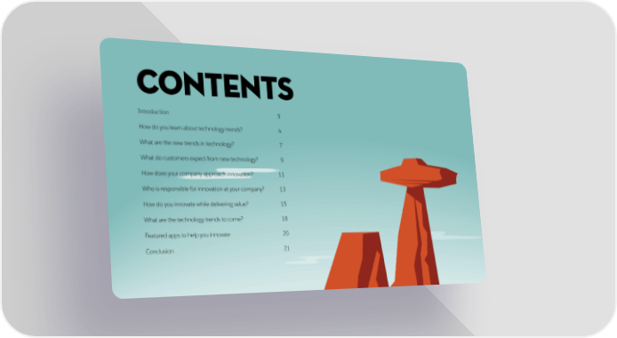 CONTENTS Introduction 3 How do you learn about technology trends? 4 What are the new trends in technology? 7 What do customers expect from new technology? 9 How does your company approach innovation? 11 Who is responsible for innovation at your company? 13 How do you innovate while delivering value? 15 What are the technology trends to come? 18 Featured apps to help you innovate 20 Conclusion 21