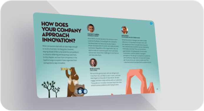 HOW DOES YOUR COMPANY VINCENT CABRAL NITIN SETH APPROACH VP PRODUCT, NINTEX CO-FOUNDER AND CEO, SCREEN-MAGIC About 90% of what we add to the product is from While the product manager uses data to make INNOVATION? customer feedback. Innovating for the enterprise inferences, it’s important to double check with has always been our focus, but we also make it the salesperson (who is actually interacting with Most companies start with an idea large enough simple and applicable for small- and medium-sized the customer) about whether we are interpreting businesses. Regardless of the organization size, we information correctly. There are sometimes to build a business. As they grow, however, want to help our customers grow their businesses, gaps between the salesperson, the recorded staying ahead of the curve (and the competition) and we learn about their challenges to see how we conversations, and the product manager’s is critical to retaining and acquiring customers. can help solve them. perceptions. We also go to prospects or customers In this chapter, we hear how companies in the with wireframes. High-level concepts don’t always AppExchange ecosystem have organized their get the job done; you need to break down the companies to stay innovative. customer problem and give them a usable solution. BOB DeSANTIS COO, CONGA We try to hire great people who are doing much more than I do, are likely to stay in touch, and have their fingers on the pulse of new trends. We also engage and listen really carefully with our customers. They guide our innovation because they’re the ones whose business problems we’re trying to solve. 11