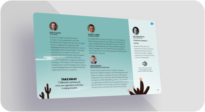 BOB DeSANTIS VINCENT CABRAL PHIL WEINMEISTER COO, CONGA VP PRODUCT, NINTEX SALESFORCE MVP Everyone at Conga is empowered to drive It is a global effort to push for innovation. We have development TRAILBLAZER COMMUNITY > innovation. In fact, adaptability is one of the teams working around the clock in Melbourne, Australia; Kuala TWITTER> foundations that Conga is built upon. We encourage Lumpur, Malaysia; Bellevue, Washington; and Irvine, California. Salesforce MVP, holder of 18 all of our employees to succeed by humbly Each team collaborates with each other and filters through the certifications, and author of Practical challenging the status quo. We embrace our roles as product managers. As a VP, it is part of my role to guide them Salesforce Development Without change agents and our responsibility to continually with the big picture in mind, upcoming trends, and features that Code, Phil is focused on engaging raise the bar on our products, services, and will benefit our customers. customers by combining community, ourselves. While our entire team drives innovation, context, and collaboration. our senior leadership team owns continuous innovation. In particular, a core group of executives, including our VP of product, VP of engineering, VP of development, and VP of strategy, work as a group MIKE DUENSING to track emerging trends and to identify those that CHIEF TECHNOLOGY OFFICER, SKUID Listen to Phil’s interview with might make sense for our customers. We don’t have one person who’s in charge of innovation. Erik Severinghaus to learn We are all in charge of innovation. One of the things that we do: about innovation at SpringCM. We give our engineers a great deal of leeway in allowing them TAKEAWAY to experiment and try new things. We meet weekly and discuss Collaboration and teamwork new ways we could be approaching problems. That motivates our engineering and product teams, because they feel like they across your organization are the keys have the freedom to try new things. Some of the capabilities to staying innovative. that have come out of these kinds of sessions are amazing. 14
