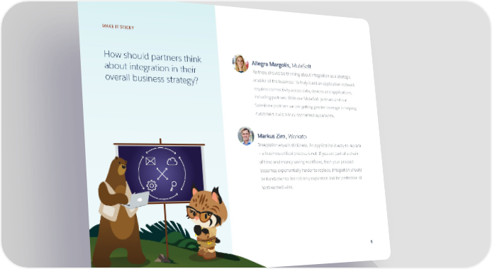 MAKE IT STICKY How should partners think Allegra Margolis, MuleSoft about integration in their Partners should be thinking about integration as a strategic overall business strategy? enabler of the business. To truly build an application network requires connectivity across data, devices and applications, including partners. With our MuleSoft partners and our Salesforce partners we are getting greater leverage in helping customers build a truly connected experience. Markus Zirn, Workato Integration equals stickiness. An application is easy to replace — a business-critical process is not. If you are part of a chain of time and money saving workflows, then your product becomes exponentially harder to replace. Integration should be fundamental for not only expansion but for protection of hard-earned wins. 9