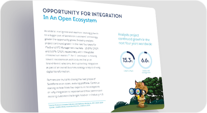 OPPORTUNITY FOR INTEGRATION In An Open Ecosystem As artificial intelligence and machine learning grow to Analysts project be a bigger part of Salesforce customers’ technology, continued growth in the greater the opportunity grows. Industry analysts next four years worldwide project continued growth in the next four years for iPaaS and API Management markets - 15.3% CAGR and 6.6% CAGR, respectively, within the global infrastructure market.* The IT landscape is moving toward microservices architectures that prize 15.3% 6.6% best-of-breed solutions. And upleveling integration as part of an overall business strategy is key to driving digital transformation. CAGR in IPaaS CAGR in API management Partners are crucial to driving the next phase of Salesforce as an open, evolving platform. Continue reading to hear from four experts in the ecosystem on why integration is important and how partners are meeting customer challenges head-on in Industry 4.0. * Gartner Forecast: Enterprise Infrastructure Software, Worldwide, 2017-2023, 1Q19 Update , Vanitha Dsilva, Laurie Wurster, et al., 26 March 2019. 33