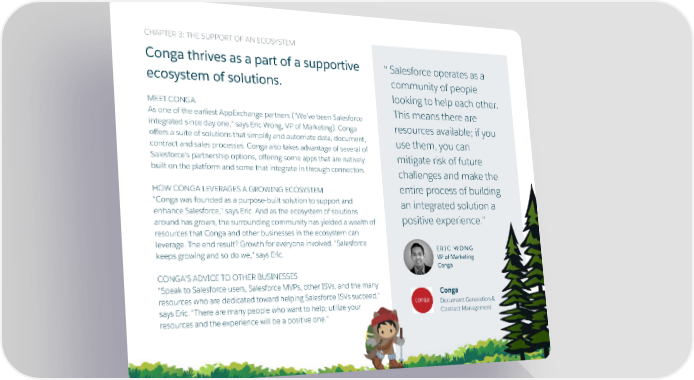 CHAPTER 3: THE SUPPORT OF AN ECOSYSTEM Conga thrives as a part of a supportive Salesforce operates as a " community of people ecosystem of solutions. looking to help each other. MEET CONGA This means there are As one of the earliest AppExchange partners ("We’ve been Salesforce integrated since day one," says Eric Wong, VP of Marketing), Conga resources available; if you offers a suite of solutions that simplify and automate data, document, use them, you can contract and sales processes. Conga also takes advantage of several of Salesforce's partnership options, offering some apps that are natively mitigate risk of future built on the platform and some that integrate in through connectors. challenges and make the HOW CONGA LEVERAGES A GROWING ECOSYSTEM entire process of building "Conga was founded as a purpose-built solution to support and an integrated solution a enhance Salesforce," says Eric. And as the ecosystem of solutions positive experience." around has grown, the surrounding community has yielded a wealth of resources that Conga and other businesses in the ecosystem can leverage. The end result? Growth for everyone involved. "Salesforce ERIC WONG keeps growing and so do we," says Eric. VP of Marketing Conga CONGA'S ADVICE TO OTHER BUSINESSES "Speak to Salesforce users, Salesforce MVPs, other ISVs, and the many Conga resources who are dedicated toward helping Salesforce ISVs succeed," Document Generation & says Eric. "There are many people who want to help; utilize your Contract Management resources and the experience will be a positive one." APPEXCHANGE: Place the title of the e-book in this space