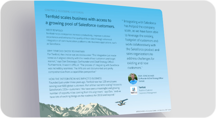 CHAPTER 2: ACCESSING CUSTOMERS " Integrating with Salesforce Tenfold scales business with access to has helped the company a growing pool of Salesforce customers. scale, as we have been able MEET TENFOLD to leverage the existing Tenfold helps companies increase productivity, improve customer footprint of customers and experience and enhance the quality of their data through advanced integration of communication platforms into business applications, such work collaboratively with as Salesforce. the Salesforce product and WHY TENFOLD CHOSE TO PARTNER sales organizations to For Tenfold, the choice was an obvious one: "The integration just made address challenges for sense as it aligned directly with the needs of our customers and target market," says Dan Sincavage, Co-Founder and Chief Strategy Officer. existing and new Furthermore, it wasn't difficult: "The process of integrating with Salesforce customers." was incredibly seamless. The APIs are well documented and pretty comprehensive from a capabilities perspective." DAN SINCAVAGE HOW THE INTEGRATION HAS IMPACTED BUSINESS Co-Founder & Chief Strategy Officer Founded just under three years ago, Tenfold now has 120 employees Tenfold serving over 600 global customers. Part of their secret to scaling? Access to Salesforce's 150k+ customers."We have seen a meaningful and growing Tenfold Realtime Customer number of opportunities coming from this alignment," says Dan, "and we Experience Management have lots of exciting things on the roadmap for 2018 and beyond." APPEXCHANGE: A Complete Guide to the Salesforce ISV Technic