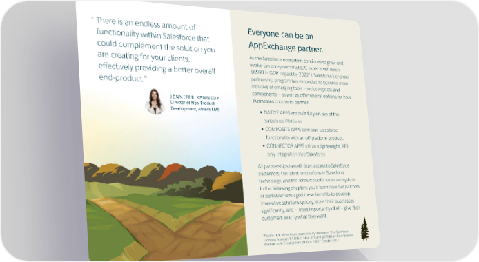 There is an endless amount of " Everyone can be an functionality within Salesforce that AppExchange partner. could complement the solution you As the Salesforce ecosystem continues to grow and are creating for your clients, evolve (an ecosystem that IDC expects will reach $859B in GDP impact by 2022*), Salesforce's channel effectively providing a better overall partnership program has expanded to become more end-product." inclusive of emerging tools – including bots and components – as well as offer several options for how JENNIFER KENNEDY businesses choose to partner: Director of New Product Development, Absorb LMS NATIVE APPS are built fully on top of the Salesforce Platform. COMPOSITE APPS combine Salesforce functionality with an off-platform product. CONNECTOR APPS utilize a lightweight, API- only integration into Salesforce. All partnerships benefit from access to Salesforce customers, the latest innovations in Salesforce technology, and the resources of a wider ecosystem. In the following chapters you'll learn how five partners in particular leveraged these benefits to develop innovative solutions quickly, scale their businesses significantly, and – most importantly of all – give their customers exactly what they want. *Source: IDC White Paper sponsored by Salesforce, “The Salesforce Economy Forecast: 3.3 Million New Jobs and $859 Billion New Business Revenue to Be Created from 2016 to 2022,” October 2017