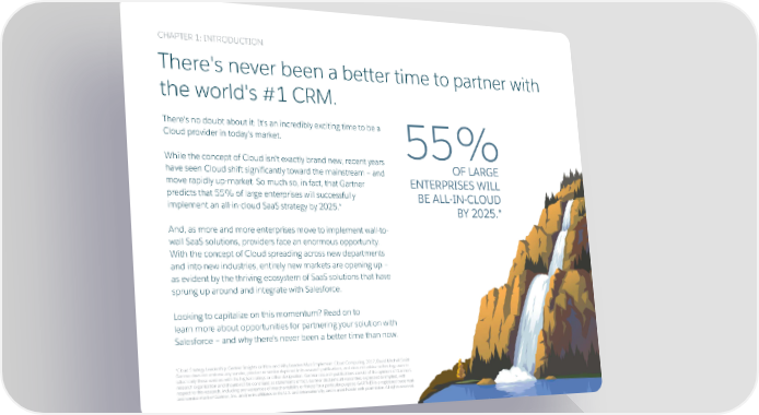 CHAPTER 1: INTRODUCTION There's never been a better time to partner with the world's #1 CRM. There's no doubt about it: It's an incredibly exciting time to be a Cloud provider in today's market. 55% While the concept of Cloud isn't exactly brand new, recent years OF LARGE have seen Cloud shift significantly toward the mainstream – and move rapidly up-market. So much so, in fact, that Gartner ENTERPRISES WILL predicts that 55% of large enterprises will successfully BE ALL-IN-CLOUD implement an all-in-cloud SaaS strategy by 2025.* BY 2025.* And, as more and more enterprises move to implement wall-to- wall SaaS solutions, providers face an enormous opportunity. With the concept of Cloud spreading across new departments and into new industries, entirely new markets are opening up – as evident by the thriving ecosystem of SaaS solutions that have sprung up around and integrate with Salesforce. Looking to capitalize on this momentum? Read on to learn more about opportunities for partnering your solution with Salesforce – and why there's never been a better time than now. *Cloud Strategy Leadership: Gartner Insights on How and Why Leaders Must Implement Cloud Computing, 2017, David Mitchell Smith Gartner does not endorse any vendor, product or service depicted in its research publications, and does not advise technology users to select only those vendors with the highest ratings or other designation. Gartner research publications consist of the opinions of Gartner's research organization and should not be construed as statements of fact. Gartner disclaims all warranties, expressed or implied, with respect to this research, including any warranties of merchantability or fitness for a particular purpose. GARTNER is a registered trademark and service mark of Gartner, Inc. and/or its affiliates in the U.S. and internationally, and is used herein with permission. All rights reserved. APPEXCHANGE: Place the title of the e-book in this space