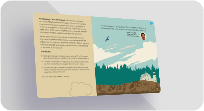 How Kenandy Cloud ERP Helped: With Salesforce, Kenandy, and Arena PLM all seamlessly connected, Primus Power was able “ The way I always put it to people is: ‘I can’t imagine us doing what to replace the manual and error-prone process of verifying up to we have done and what we are currently doing without Kenandy.’” 1,000 line items per Bill of Materials (BOM). Engineering can now create a new BOM in the PLM system, and minutes later, the same – MARK COLLINS PRIMUS POWER information would be available in Kenandy and Salesforce. VP OF OPERATIONS Kenandy also provided Primus Power with access to real-time financial and operational data. Sales representatives can see the actual inventory, engineering can look up delivery dates of parts that have been ordered, and management has a better understanding of the health of the business. The Results: Sped up processes and controls to keep up with the 50%-60% growth rate in their vertical by running CRM, PLM, and ERP on the same platform Delivered live data of its sourcing process, plus full traceability of orders, by whom and at what price, alongside the order’s entire history Benefitted from the collaboration capabilities of the platform by using Chatter, integrated with Kenandy, to help clarify specific documents such as purchase orders and invoices FIND OUT MORE ABOUT KENANDY CLOUD ERP > 16