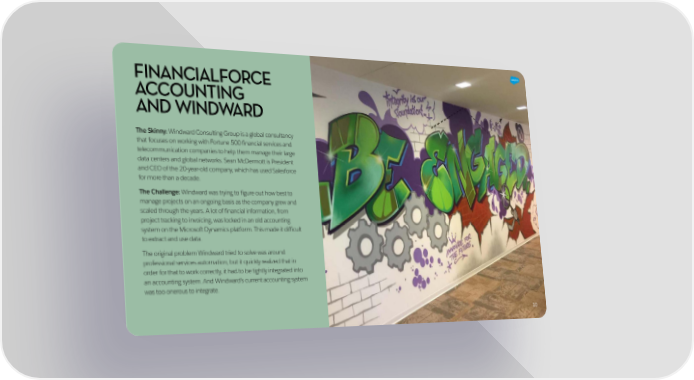 FINANCIALFORCE ACCOUNTING AND WINDWARD The Skinny: Windward Consulting Group is a global consultancy that focuses on working with Fortune 500 financial services and telecommunication companies to help them manage their large data centers and global networks. Sean McDermott is President and CEO of the 20-year-old company, which has used Salesforce for more than a decade. The Challenge: Windward was trying to figure out how best to manage projects on an ongoing basis as the company grew and scaled through the years. A lot of financial information, from project tracking to invoicing, was locked in an old accounting system on the Microsoft Dynamics platform. This made it difficult to extract and use data. The original problem Windward tried to solve was around professional services automation, but it quickly realized that in order for that to work correctly, it had to be tightly integrated into an accounting system. And Windward’s current accounting system was too onerous to integrate. 10