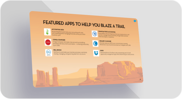 FEATURED APPS TO HELP YOU BLAZE A TRAIL ACCOUNTING SEED FINANCIALFORCE ACCOUNTING Accounting Seed automates your accounting with sales FinancialForce Accounting streamlines your opportunity-to-cash and marketing while managing financials across your entire process, manages revenue precisely, and generates real-time business cycle. financial analysis on Salesforce. CONGA COMPOSER KENANDY CLOUD ERP Conga Composer eliminates manual work by simplifying Kenandy maps your ERP to your core processes, boosting processes with document automation — increasing productivity efficiencies in your business processes as it integrates with CRM. up to 100x. DELL BOOMI SKUID Dell Boomi automates your business processes, seamlessly Skuid transforms UX without code, empowering users to build moving, managing, and governing data from any source. opportunity management apps while streamlining your sales process. 20