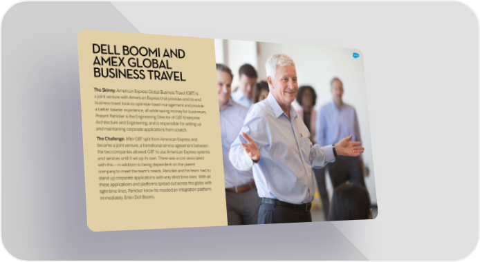 DELL BOOMI AND AMEX GLOBAL BUSINESS TRAVEL The Skinny: American Express Global Business Travel (GBT) is a joint venture with American Express that provides end-to-end business travel tools to optimize travel management and provide a better traveler experience, all while saving money for businesses. Prasant Panicker is the Engineering Director of GBT Enterprise Architecture and Engineering, and is responsible for setting up and maintaining corporate applications from scratch. The Challenge: After GBT split from American Express and became a joint venture, a transitional service agreement between the two companies allowed GBT to use American Express systems and services until it set up its own. There was a cost associated with this — in addition to being dependent on the parent company to meet the team’s needs, Panicker and his team had to stand up corporate applications with very strict time lines. With all these applications and platforms spread out across the globe with tight time lines, Panicker knew he needed an integration platform immediately. Enter Dell Boomi. 7