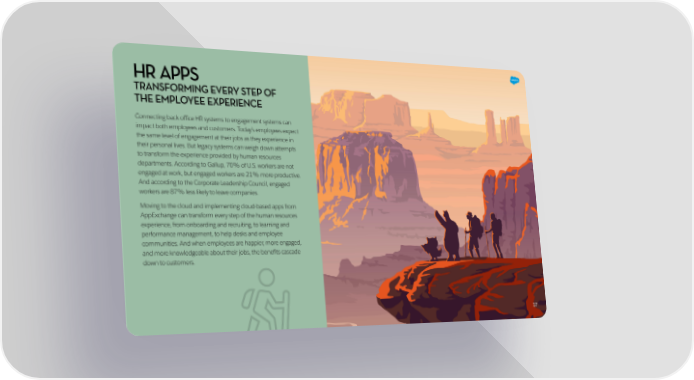 HR APPS TRANSFORMING EVERY STEP OF THE EMPLOYEE EXPERIENCE Connecting back office HR systems to engagement systems can impact both employees and customers. Today’s employees expect the same level of engagement at their jobs as they experience in their personal lives. But legacy systems can weigh down attempts to transform the experience provided by human resources departments. According to Gallup, 70% of U.S. workers are not engaged at work, but engaged workers are 21% more productive. And according to the Corporate Leadership Council, engaged workers are 87% less likely to leave companies. Moving to the cloud and implementing cloud-based apps from AppExchange can transform every step of the human resources experience, from onboarding and recruiting, to learning and performance management, to help desks and employee communities. And when employees are happier, more engaged, and more knowledgeable about their jobs, the benefits cascade down to customers. 17