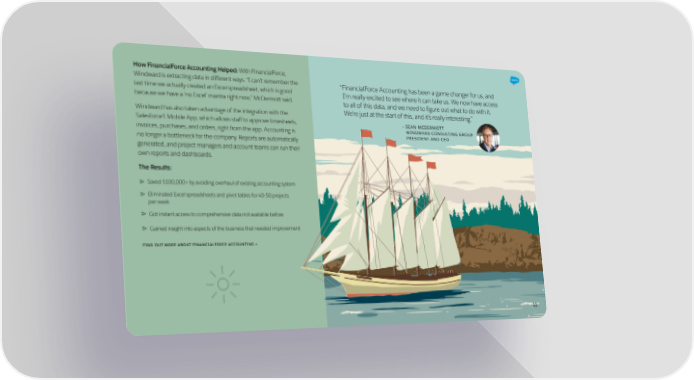 How FinancialForce Accounting Helped: With FinancialForce, Windward is extracting data in different ways. “I can’t remember the “ FinancialForce Accounting has been a game changer for us, and last time we actually created an Excel spreadsheet, which is good I’m really excited to see where it can take us. We now have access because we have a ‘no Excel’ mantra right now,” McDermott said. to all of this data, and we need to figure out what to do with it. Windward has also taken advantage of the integration with the We’re just at the start of this, and it’s really interesting.” Salesforce1 Mobile App, which allows staff to approve timesheets, – SEAN MCDERMOTT invoices, purchases, and orders, right from the app. Accounting is WINDWARD CONSULTING GROUP PRESIDENT AND CEO no longer a bottleneck for the company. Reports are automatically generated, and project managers and account teams can run their own reports and dashboards. The Results: Saved $100,000+ by avoiding overhaul of existing accounting system Eliminated Excel spreadsheets and pivot tables for 40-50 projects per week Got instant access to comprehensive data not available before Gained insight into aspects of the business that needed improvement FIND OUT MORE ABOUT FINANCIALFORCE ACCOUNTING > 11