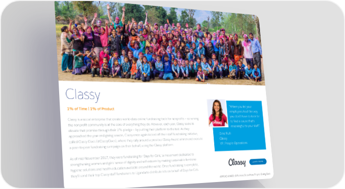 Classy "When you let your 1% of Time | 1% of Product employees lead the way you don't have to look far Classy is a social enterprise that creates world-class online fundraising tools for nonprofits – so serving to find a cause that's the nonprofit community is at the core of everything they do. However, each year, Classy seeks to meaningful to your staff." elevate that promise through their 1% pledge – by putting their platform to the test. As they approached the year-end giving season, Classy once again kicked off their staff fundraising initiative, - Dina Rulli called Classy Gives (#ClassyGives), where they rally around a previous Classy Award winner and execute Classy a peer-to-peer fundraising campaign on their behalf, using the Classy platform. VP, People Operations As of mid-November 2017, they were fundraising for 'Days for Girls,' a movement dedicated to strengthening women and girls' sense of dignity and self-esteem by making sustainable feminine LEARN MORE hygiene solutions and health education available around the world. Once fundraising is complete, they'll send their top Classy staff fundraisers to Uganda to distribute kits on behalf of Days for Girls. APPEXCHANGE: 6 Partners Share How They're Giving Back