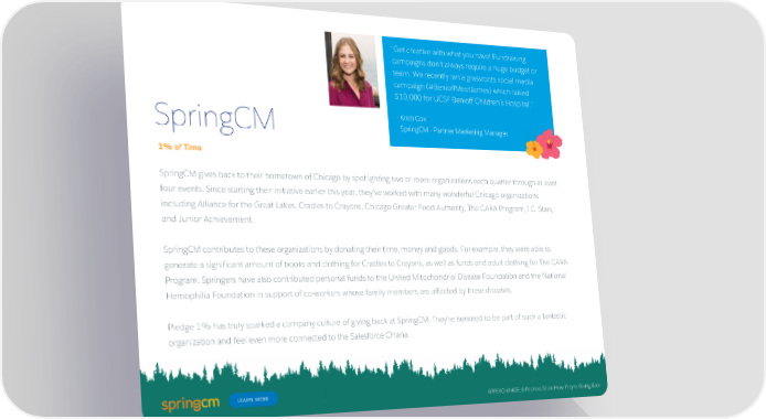 "Get creative with what you have! Fundraising campaigns don’t always require a huge budget or team. We recently ran a grassroots social media campaign (#BenioffMeetJames) which raised $10,000 for UCSF Benioff Children’s Hospital." - Kristi Cox SpringCM - Partner Marketing Manager SpringCM 1% of Time SpringCM gives back to their hometown of Chicago by spotlighting two or more organizations each quarter through at least four events. Since starting their initiative earlier this year, they've worked with many wonderful Chicago organizations including Alliance for the Great Lakes, Cradles to Crayons, Chicago Greater Food Authority, The CARA Program, I.C. Stars, and Junior Achievement. SpringCM contributes to these organizations by donating their time, money and goods. For example, they were able to generate a significant amount of books and clothing for Cradles to Crayons, as well as funds and adult clothing for The CARA Program. Springers have also contributed personal funds to the United Mitochondrial Disease Foundation and the National Hemophilia Foundation in support of co-workers whose family members are affected by these diseases. Pledge 1% has truly sparked a company culture of giving back at SpringCM. They're honored to be part of such a fantastic organization and feel even more connected to the Salesforce Ohana. LEARN MORE APPEXCHANGE: 6 Partners Share How They're Giving Back APPEXCHANGE: Place the title of the e-book in this space