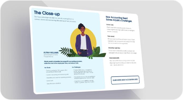 The Close-up How Accounting Seed Solves Aliyah’s Challenges See how a development director uses Accounting Seed to connect donor and accounting data and automate processes. Lower costs Aliyah’s organization saves thousands of dollars by connecting data on a single platform and eliminating the need for a connector. Time saved With automated workflows and custom reports, Aliyah’s organization has freed up weeks of employee time that now can be spent on more urgent tasks. Smoother cash flow Donations are now tracked accurately on a regular basis ALIYAH WILLIAMS and adjustments can easily be made if they’re not on target. Development Director FreedomChild More bandwidth Aliyah needs to streamline her nonprofit’s accounting processes, Now that an efficient accounting process is in place, make the most of her employees’ time, and reduce costs. Aliyah has more time to focus on what she really does best — interact with donors. Her Goals: Her Challenges: - Track accounting for 300+ projects that - FreedomChild’s donor management are running simultaneously system and accounting system are on separate platforms with a lot of manual - Connect accounting and fundraising data processes in between - Streamline and automate reporting processes - Manual processes are time-consuming and introduce opportunities for human error - Lower costs - Information is not available in a timely LEARN MORE ABOUT ACCOUNTING SEED - Grow the donor database manner to generate reports for the CEO