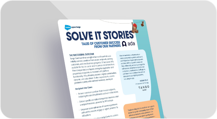 SOLVE IT STORIES TALES OF CUSTOMER SUCCESS FROM OUR PARTNERS THE SUCCESSFUL OUTCOME Tango Card launched a single instance of Ada that could Ada immediately understood our initially address questions from reward recipients, existing vision, presented a path to achieve it, customers, and new business prospects. It had some APIs and helped us implement a dynamic available for Ada to use in order to personalize interactions. solution within a quick turnaround Then it expanded and layered enterprise application and time. Ultimately we beat our target for proprietary endpoints via Workato’s API platform self-service, delighted recipients and functionality. This ultimately created a highly contextualized, customers, convinced our colleagues, dynamic, and data-driven chatter experience to address and have since continued to roll out problems quickly with minimal necessary user input. Ada across our digital properties, including in-app. Recipient Use Cases ADAM COLE VP, Business Technology • Answer common questions from reward recipients, including the use of multimedia such as in-chat videos • Deliver specific and tailored responses based on what a recipient received, powered by API lookups • Empower quick self-service of common problems without the need to engage an agent, powered by API actions Implementing Ada has enabled our support • Reference the Salesforce Help Center to address teams to spend substantially more of their questions that require more detail efforts on harder-to-solve problems. Our customers are now able to quickly serve • Generate readily actionable support cases in themselves for most common problems — Service Cloud that are decorated with recipientdetails, or get to a knowledgeable agent without a description of their problem, an AI-generated writing an essay. When we compare to the summary of the automated conversation with Ada, year before, the volume of cases our reps are and reward details manually addressing is much lower. They now can spend the bulk of their time Prospect Use Cases answering those complicated questions versus those easy lifts. • Understand more about prospects by leveraging API WALTER TUCKER lookups from minimal chatter input, delivering a Director of Support, Tango Card personalized experience and saving time by routing them to the right resources for engagement • Quickly point prospects to the best path that fits their immediate intent, such as directing them to a self-service sign-up flow