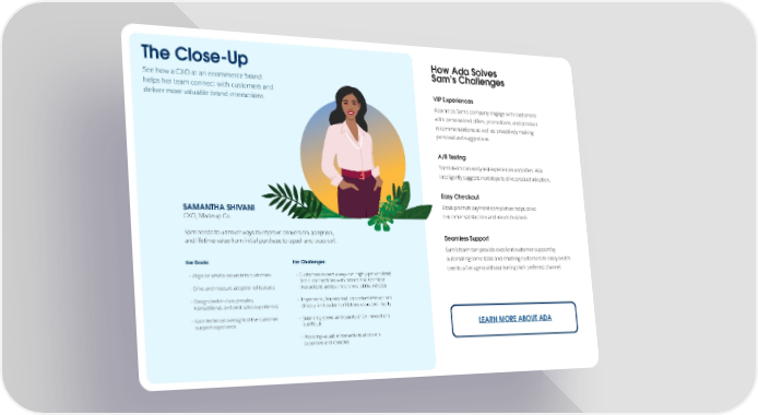 The Close-Up How Ada Solves Sam’s Challenges See how a CXO at an ecommerce brand helps her team connect with customers and VIP Experiences deliver more valuable brand interactions. Ada helps Sam’s company engage with customers with personalized offers, promotions, and product recommendations as well as proactively making personalized suggestions. A/B Testing Sam’s team can easily test experiences and offers. Ada intelligently suggests next steps to drive product adoption. Easy Checkout SAMANTHA SHIVANI Ada’s prompt payment completion helps drive CXO, Madeup Co. customer satisfaction and return business. Sam needs to uncover ways to improve conversion, adoption, Seamless Support and lifetime value from initial purchase to upsell and cross-sell. Sam’s team can provide excellent customer support by Her Goals: Her Challenges: automating some tasks and enabling customers to easily switch over to a live agent without leaving their preferred channel. - Align on what is valuable to customers - Customers expect always-on, highly personalized 1-to-1 connections with brands and seamless - Drive and measure adoption of features interactions across the channel of their choice - Design best-in-class presales, - Impersonal, Impersonal, discordant interactions transactional, and post-sales experiences directly limit customer lifetime value and loyalty - Gain technical oversight of the customer - Balancing speed and quality of CX interactions support experience is difficult LEARN MORE ABOUT ADA - Providing valuable interactions at scale is expensive and complex