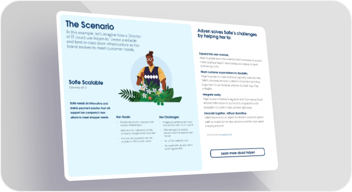 The Scenario Adyen solves So昀椀e’s challenges by helping her to: In this example, let’s imagine how a Director of IT could use Adyen to create a reliable and best-in-class store infrastructure as her brand evolves to meet customer needs. Expand into new markets. Adyen’s global reach has enabled So昀椀e’s company to acquire more local business in new markets and reduce its bank declines by 21%. Meet customer expectations for 昀氀exibility. Adyen’s access to major and local payment methods help So昀椀e’s company increase customer conversion by letting So昀椀e Scalable it pay how it’s comfortable, whether it’s Cash App, Visa, Director of IT or PayPal. Integrate easily. Adyen’s out-of-the-box integration with Commerce Cloud So昀椀e needs an innovative and allowed So昀椀e’s team to access its full capabilities and stable payment solution that will ecosystem of point-of-sale partners right away. support her company’s new Innovate together, without downtime. e昀昀orts to meet shopper needs. Her Goals: Her Challenges: So昀椀e’s team relies on Adyen for its track record of system • Provide stores with a scalable and • A legacy payment system that is stability in addition to new solutions and the most recent reliable infrastructure slow and lacks technical support industry research. • Add value for customers and the • Di昀昀erent payment services company through vendor selection providers and methods for each market 1 According to Adyen’s US Retail Report 2023. • Pick the best payments services provider for the brand’s needs • No uni昀椀ed customer view • Perceived di昀케culty and cost of switching providers Learn more about Adyen