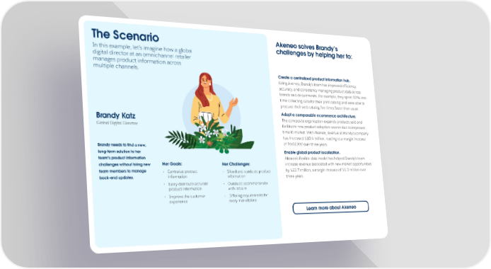 The Scenario Akeneo solves Brandy’s In this example, let’s imagine how a global challenges by helping her to: digital director at an omnichannel retailer manages product information across multiple channels. Create a centralized product information hub. Using Akeneo, Brandy’s team has improved efficiency, accuracy, and consistency managing product data across brands and departments. For example, they spent 50% less time collecting data for their print catalog and were able to produce their web catalog five times faster than usual. Adopt a composable ecommerce architecture. Brandy Katz The composite organization expands products sold and Global Digital Director facilitates new product adoption sooner due to improved time to market. With Akeneo, revenue at Brandy’s company has increased $10.4 million, leading to a margin increase Brandy needs to find a new, of $600,000 over three years. long-term solution to her Enable global product localization. team’s product information Akeneo’s flexible data model has helped Brandy’s team challenges without hiring new Her Goals: Her Challenges: increase revenue associated with new market opportunities team members to manage • Centralize product • Siloed and outdated product by $22.7 million, a margin increase of $1.3 million over back-end updates. information information three years. • Easily distribute accurate • Outdated ecommerce site product information architecture • Improve the customer • Differing requirements for experience every marketplace Learn more about Akeneo