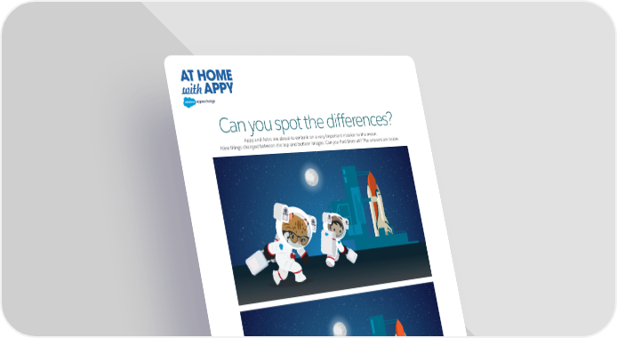 Can you spot the differences? Appy and Astro are about to embark on a very important mission to the moon. Nine things changed between the top and bottom images. Can you find them all? The answers are below. s.daert gnssiims i toobs ’orstA fo omttob heT 9. .gnssiim eras epirst gels ’yppA 8. .regonls i seactsuis ’orstA 7. .wodnwi eons ah ylon rewoth cunaL 6. .orolc tnereffid eras uglp sthecs ’yppA 5. .gnssiims i aremac temlhes ‘ o rstA 4. h.ctap redshouls hi gnssiims io rstA 3. .degnahcs i orolc tekocR 2. .tnereffid eras thgil temlhes ’yppA 1. s:reswnA AT HOME WITH APPY 8