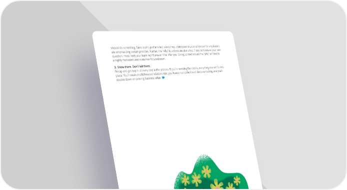 should do something. Sales teams perform best when they understand situational context for why leaders are emphasizing certain priorities. Further, the “why” questions are also a test. If you can’t answer your own question, most likely your team won’t answer it for it for you. Giving context around the “why” will lead to a highly motivated and customer-focused team. 3. Show them. Don’t tell them. Recap and get buy-in at every step in the process. If you’re sweating the details, everything else will fall into place: You’ll create multithreaded relationships, you’ll understand the line of decision-making, and you’ll double down on proving business value. 9