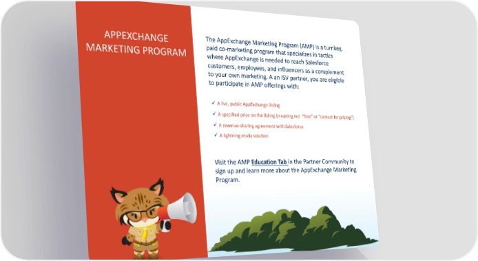 APPEXCHANGE The AppExchange Marketing Program (AMP) is a turnkey, MARKETING PROGRAM paid co-marketing program that specializes in tactics where AppExchange is needed to reach Salesforce customers, employees, and influencers as a complement to your own marketing. A an ISV partner, you are eligible to participate in AMP offerings with: üA live, public AppExchange listing üA specified price on the listing (meaning not “free” or “contact for pricing”) üA revenue-sharing agreement with Salesforce üA lightning ready solution Visit the AMP Education Tab in the Partner Community to sign up and learn more about the AppExchange Marketing Program.