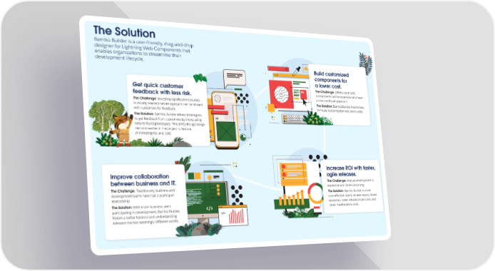 The Solution Bambú Builder is a user-friendly, drag-and-drop designer for Lightning Web Components that enables organizations to streamline their development lifecycle. Build customized components for a lower cost. The Challenge: Off-the-shelf LWC Get quick customer feedback with less risk. components can be expensive and have a one-size-fits-all approach. The Challenge: Investing significant resources The Solution: Bambú Builder incentivizes is usually needed before a project can be shared in-house customization and saves costs. with customers for feedback. The Solution: Bambú Builder allows developers to get feedback from customers by showcasing easy-to-build prototypes. This shifts the go/no-go decision earlier in the project schedule, minimizing risk and cost. Increase ROI with faster, Improve collaboration agile releases. between business and IT. The Challenge: Manual development is The Challenge: Traditionally, business and expensive and time-consuming. The Solution: Bambú Builder is more development teams have had a push/pull cost-effective due to smaller teams, fewer relationship. The Solution: With more business users resources, lower infrastructure costs, and lower maintenance costs. participating in development, Bambú Builder, fosters a better balance and understanding between the two seemingly different worlds.