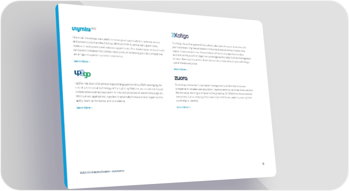 Unymira’s knowledge base platform is designed specifically for customer service The Xotigo Sales Management Suite allows sales teams to spend more time with and powers customers like Daimler, BMW and VW. It centralises support data, your customers. Engineered based on the extensive experience of automotive replaces siloed systems and reduces support costs. This means faster, more efficient supply industry experts, our three modules efficiently manage the complete service and increased first contact resolutions while helping provide a competitive automotive lifecycle from Opportunity Management to Sales Contract Management advantage in superior customer experience. to Sales Planning Simulations. Boost productivity and accelerate faster with Xotigo out-of-the-box solutions. Learn More > Learn More > Up2Go has been a Salesforce AppExchange partner since 2010. Leveraging the Zuora is a purpose-built subscription management platform that empowers one-of-a-kind social technology of the Lightning Platform, we enable role-based, companies to increase user acquisition, improve retention, and maximise customer collaborative business execution for the core processes of automotive suppliers. lifetime value. Working with seven of the global top 10 OEMs from the automotive With our two applications, suppliers dramatically increase overall organisational ecosystem, Zuora is helping them build a business service platform, moving from agility, team performance, and compliance. ownership to usership. Learn More > Learn More > EMEA ISV Industry Booklet — Automotive 6
