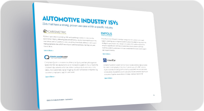 AUTOMOTIVE INDUSTRY ISVs ISVs that have a strong, proven use case within a specific industry MyGuest specialises in providing CRM and marketing solutions for clients in the Empolis provides AI-based knowledge management for customer service and automotive industry, delivering ease and efficiency. Let your sales reps focus on the support, enabling users to improve decision quality in troubleshooting, due to the road ahead and let CarisMetric cover everything from leads, delivery of vehicle and intelligent representation of all relevant information. With additional predictive fleet agreements. Get a 360°view of your customers and see what they own, and analytics capabilities for IoT, the comprehensive Empolis solution optimises love to drive. machine availability, automates root-cause-analysis and increases overall support service performance. Learn More > Learn More > ComplianceQuest is a modern-cloud Enterprise Quality and Safety Management System (QHSE) natively built and run on the Salesforce platform. Our unified QHSE LinkedCar’s platform streamlines & connects the sales and after-sales processes solutions help customers of all sizes deliver quality products and services in the for dealers creating loyalty to the driver. It provides you with a 360° overview safest, most sustainable way by mitigating risk, and inefficiencies while protecting of your customer, including GDPR consents, quotes, DMS-links or social media customers, employees, suppliers and brand. conversations. Our platform also includes a multi-brand connected app for your consumers. Together we are drivers of change, creating drivers for life! Learn More > Learn More > EMEA ISV Industry Booklet — Automotive 4