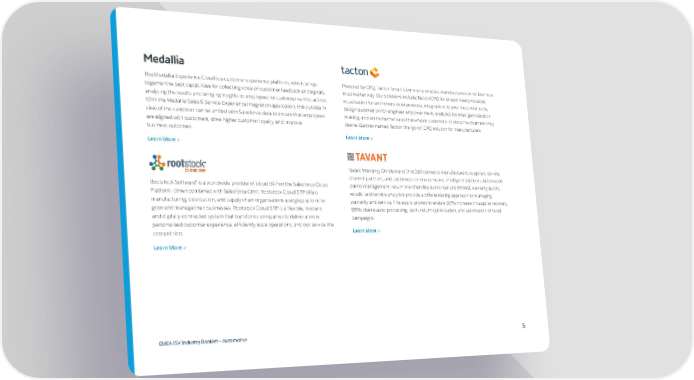 The Medallia Experience Cloud is a customer experience platform, which brings Powered by CPQ, Tacton Smart Commerce enables manufacturers to do business together the best capabilities for collecting voice-of-customer feedback and signals, in a smarter way. Our solutions include Tacton CPQ for streamlined processes, analysing the results and bringing insights to employees for customer-centric action. visualisation for an immersive experience, integrations to your most vital tools, With the Medallia Sales & Service Experience integration application, this outside-in design automation for engineer empowerment, analytics for intelligent decision view of the customer can be unified with Salesforce data to ensure that employees making, and omnichannel sales that enable customers to shop the channels they are aligned with customers, drive higher customer loyalty, and improve desire. Gartner named Tacton the ‘go-to’ CPQ solution for manufacturers. business outcomes. Learn More > Learn More > Tavant Warranty On-Demand (TWOD) connects manufacturers, suppliers, service channel partners, and customers on one cohesive, intelligent platform. Automated Rootstock Software® is a worldwide provider of cloud ERP on the Salesforce Cloud claims management, return merchandise authorisations (RMAs), warranty audits, Platform. When combined with Salesforce CRM, Rootstock Cloud ERP offers recalls, and service analytics provide a differentiating approach to managing manufacturing, distribution, and supply chain organisations a single platform to warranty and service. The app is proven to enable 50% increase in supplier recovery, grow and manage their businesses. Rootstock Cloud ERP is a flexible, modern, 85% claims auto-processing, parts return optimisation, and automation of recall and digitally-connected system that transforms companies to deliver a more campaigns. personalised customer experience, efficiently scale operations, and out-service the competition. Learn More > Learn More > EMEA ISV Industry Booklet — Automotive 5