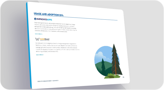usage and adoption ISVs Improved Apps is the only native digital enablement tool for Salesforce. It helps improve user productivity and knowledge by engaging employees, customers and partners in their preferred way. Now, all the training, learning and knowledge absorption can be done in-situ, at the user’s point of need, on any device. A typical customer will see a return on investment within three months. Learn More > InsideBoard is the first digital platform for change management integrated into Salesforce, to boost, measure and sustain user adoption and team performance. Leveraging AI and the power of communities, InsideBoard is the most complete solution for engaging employees in a seamless, self-service and personalised manner and driving company transformation ROI. Learn More > EMEA ISV Industry Booklet — Automotive 25