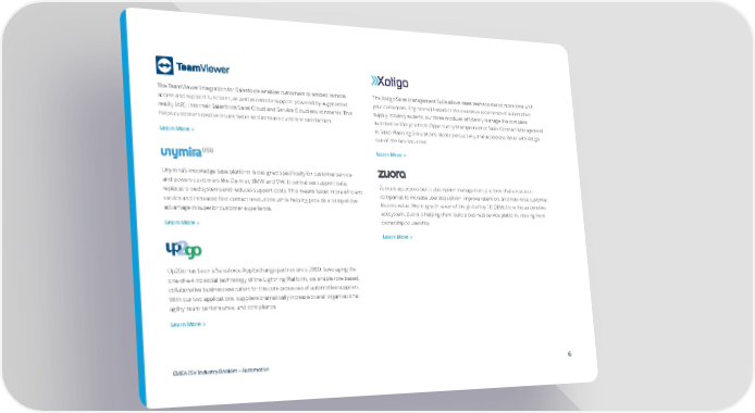 The TeamViewer integration for Salesforce enables customers to embed remote The Xotigo Sales Management Suite allows sales teams to spend more time with access and support functions, as well as remote support powered by augmented your customers. Engineered based on the extensive experience of automotive reality (AR), into their Salesforce Sales Cloud and Service Cloud environments. This supply industry experts, our three modules efficiently manage the complete helps customers resolve issues faster and increase customer satisfaction. automotive lifecycle from Opportunity Management to Sales Contract Management to Sales Planning Simulations. Boost productivity and accelerate faster with Xotigo Learn More > out-of-the-box solutions. Learn More > Unymira’s knowledge base platform is designed specifically for customer service and powers customers like Daimler, BMW and VW. It centralises support data, Zuora is a purpose-built subscription management platform that empowers replaces siloed systems and reduces support costs. This means faster, more efficient companies to increase user acquisition, improve retention, and maximise customer service and increased first contact resolutions while helping provide a competitive lifetime value. Working with seven of the global top 10 OEMs from the automotive advantage in superior customer experience. ecosystem, Zuora is helping them build a business service platform, moving from Learn More > ownership to usership. Learn More > Up2Go has been a Salesforce AppExchange partner since 2010. Leveraging the one-of-a-kind social technology of the Lightning Platform, we enable role-based, collaborative business execution for the core processes of automotive suppliers. With our two applications, suppliers dramatically increase overall organisational agility, team performance, and compliance. Learn More > EMEA ISV Industry Booklet — Automotive 6