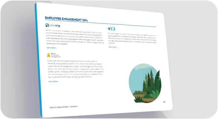 employee engagement ISVS SalesTrip is an expense management and travel booking system on Salesforce. Do HR, talent, engagement, performance, people analytics, and payroll are high on the your employees waste time switching between Salesforce, travel booking sites and business agenda and, for Salesforce customers, XCD offers the only single solution. your expense system just to visit customers? SalesTrip combines this. As a business, With three-quarters of UK organisations predicted to increase their HR tech budget does it take days to reconcile these employee travel costs against specific customers, this year, the market potential is huge. So if they say HR, payroll or people software, projects and sales opportunities? SalesTrip automates this. Better manage and justify think XCD. expense spend with SalesTrip. Learn More > Learn More > Bullhorn Workforce Management powers the world’s dynamic workforce. The world’s leading employers transform their business operations by relying on Bullhorn Workforce Management to streamline the management of their hourly workers. Our cloud-based software enables management to save valuable time in scheduling shifts, managing compliance, monitoring staff, and processing payroll, while increasing gross profit for temporary staffing agencies struggling with the evolving demands of the rapidly emerging dynamic workforce. Learn More > EMEA ISV Industry Booklet — Automotive 20