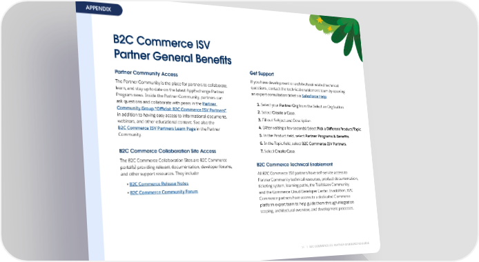 APPENDIX B2C Commerce ISV Partner General Bene昀椀ts Get Support Partner Community Access If you have development or architectural-related technical The Partner Community is the place for partners to collaborate, questions, contact the technical enablement team by opening learn, and stay up to date on the latest AppExchange Partner an expert consultation ticket via Salesforce Help: Program news. Inside the Partner Community, partners can ask questions and collaborate with peers in the Partner 1. Select your Partner Org from the Select an Org button. Community Group “O昀케cial: B2C Commerce ISV Partners” 2. Select Create a Case. in addition to having easy access to informational documents, 3. Fill out Subject and Description. webinars, and other educational content. See also the B2C Commerce ISV Partners Learn Page in the Partner 4. (After waiting a few seconds) Select Pick a Di昀昀erent Product/Topic. Community. 5. In the Product 昀椀eld, select Partner Programs & Bene昀椀ts. 6. In the Topic 昀椀eld, select B2C Commerce ISV Partners. B2C Commerce Collaboration Site Access 7. Select Create Case. The B2C Commerce Collaboration Sites are B2C Commerce portal(s) providing relevant documentation, developer forums, B2C Commerce Technical Enablement and other support resources. They include: All B2C Commerce ISV partners have self-service access to • B2C Commerce Release Notes Partner Community technical resources, product documentation, • B2C Commerce Community Forum ticketing system, learning paths, the Trailblazer Community, and the Commerce Cloud Developer Center. In addition, B2C Commerce partners have access to a dedicated Commerce platform expert team to help guide them through integration scoping, architectural overview, and development processes. 14 B2C COMMERCE ISV PARTNER ONBOARDING GUIDE