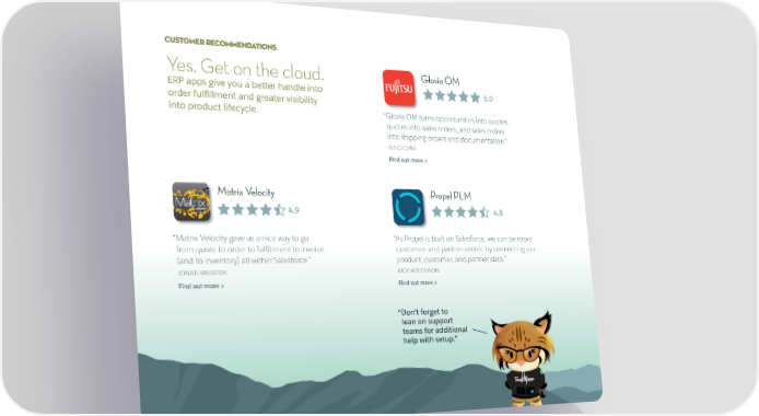 CUSTOMER RECOMMENDATIONS Yes. Get on the cloud. Glovia OM ERP apps give you a better handle into 5.0 order fulfillment and greater visibility “ Glovia OM turns opportunities into quotes, into product lifecycle. quotes into sales orders, and sales orders into shipping orders and documentation.” TENO CIPRI Find out more > Matrix Velocity Propel PLM 4.9 4.8 “ Matrix Velocity gave us a nice way to go “ As Propel is built on Salesforce, we can be more from quote to order to fulfillment to invoice customer- and partner-centric by connecting our (and to inventory) all within Salesforce.” product, customer, and partner data.” JONATHAN ROWE RICK AUSTINSON Find out more > Find out more > “ Don’t forget to lean on support teams for additional help with setup.”