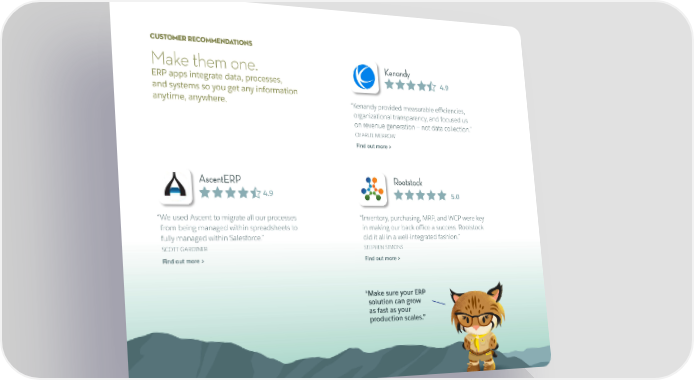 CUSTOMER RECOMMENDATIONS Make them one. Kenandy ERP apps integrate data, processes, 4.9 and systems so you get any information anytime, anywhere. “ Kenandy provided measurable efficiencies, organizational transparency, and focused us on revenue generation — not data collection.” CHARLIE MERROW Find out more > AscentERP Rootstock 4.9 5.0 “ We used Ascent to migrate all our processes “ Inventory, purchasing, MRP, and WCP were key from being managed within spreadsheets to in making our back office a success. Rootstock fully managed within Salesforce.” did it all in a well-integrated fashion.” SCOTT GARDINER STEPHEN SIMONS Find out more > Find out more > “Mak e sure your ERP solution can grow as fast as your production scales.”
