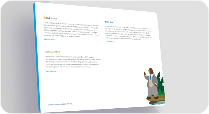 A Global RiskTech 100 provider of Anti-Money Laundering (AML) screening and client Differentiate Salesforce Financial Services Cloud (FSC) from the competition and win lifecycle risk-management software, established by some of the world’s leading AML new logos with Zenoo vDoc. It enagbles the digital onboarding of customers directly experts and data scientists. Responding to the needs of its KYC360 community of into Salesforce FSC. Zenoo provides all the tools, integrations to services, like ID 30,000 compliance professionals, its solutions are consistently powerful and agile. verification, and background checks to get banks up and running quickly and enjoy Consequently, RiskScreen is used globally by over 700 financial services businesses, an excellent customer experience. Zenoo vDoc, FSC and Salesforce Marketing Cloud industrials, regulators and law-enforcement agencies. is the unique, compelling digital solution for Financial Services. Find out more > Find out more > Tailored to the needs of capital markets, Singletrack offers CRM, research distribution, corporate access and analytics to the sellside, enabling firms to pinpoint and leverage compelling research and relations. Singletrack’s buyside offering comprises provider relations, research assessment and contract management to facilitate regulatory compliance and ease administrative overheads Find out more > EMEA ISV Industry Booklet – Banking
