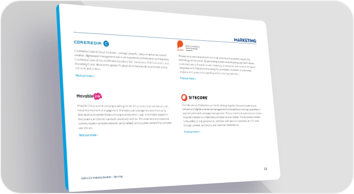 Marketing CoreMedia Content Cloud. Be Iconic. Leverage powerful, easy omnichannel content Phrasee empowers brands with the most advanced AI-powered copywriting creation, digital asset management and multi-experience orchestration by integrating technology on the planet. By generating human-sounding language that’s always CoreMedia Content Cloud DXP with Salesforce B2C Commerce, B2B Commerce, and in a brand’s voice, Phrasee boosts marketing performance and revenue. Phrasee’s Marketing Cloud. Move at the speed of culture and create iconic experiences across integration with Salesforce Marketing Cloud enables marketers to seamlessly channels and devices. implement AI-powered copywriting without leaving Salesforce. Find out more > Find out more > Movable Ink powered campaigns auto-generate 1:1 personalised content at scale, The Sitecore and Salesforce partnership brings together Sitecore’s leadership in live at the moment of engagement. Marketers can leverage first and third-party content and digital experience management and Salesforce’s leading capabilities in data sources to power these campaigns across email, web, and mobile, based on segmentation and campaign management. The partnership is centered around two the creative and brand standards previously defined. This ensures every customer important tenets of unified data and faster time to market. The by-product results communication contains relevant, personalised, and accurate content that compels in the ability to truly personalise, optimise, and speak to customers at a 1:1 level users to act. through content, campaigns, and customer relationships. Find out more > Find out more > EMEA ISV Industry Booklet – Banking 1313