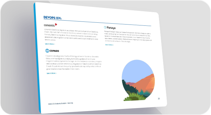 devops ISVs conemis is Salesforce migration, automated. With pre-built paths from Salesforce, Panaya’s ForeSight helps you foresee the impact and risk of any change you plan to Oracle, Microsoft, SAP and more to Salesforce, conemis removes risks and delays make, before going live in production. You can run an impact analysis in real time, from any Salesforce migration. The collaborative cloud tool accelerates source based on the dependencies of the components in your Salesforce org, including: assessment, data migration, consolidation, and overall project timelines for a fast apex classes, process builders, fields and more. Imagine your next deployment with lane to success. confidence, minus the risk. That’s ForeSight. Learn More > Learn More > Copado is a leading native DevOps & Testing platform for Salesforce. We enable faster, error-free digital cloud deployments and upgrades with continuous integration and deployment technologies. All this is delivered via a native, enterprise- class developer platform which is fully integrated with Salesforce DX and Salesforce Clouds. Copado delivers the quality, speed and scale required by central and local governments to meet the needs of their citizens. Learn More > EMEA ISV Industry Booklet — Banking 22