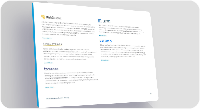 A Global RiskTech 100 provider of Anti-Money Laundering (AML) screening and Tier1 Financial Solutions is a leading global client relationship management client lifecycle risk-management software, established by some of the world’s leading technology provider with a 100% focus on capital markets & investment banking AML experts and data scientists. Responding to the needs of its KYC360 community professionals. A purpose-built CRM providing real-time & mobile access maximizing of 30,000 compliance professionals, its solutions are consistently powerful and agile. client interactions while increasing productivity and reducing relationship risk. Consequently, RiskScreen is used globally by over 700 financial services businesses, industrials, regulators and law-enforcement agencies. Learn More > Learn More > Differentiate Salesforce Financial Services Cloud (FSC) from the competition and win new logos with Zenoo vDoc. It enables the digital onboarding of customers directly Tailored to the needs of capital markets, Singletrack offers CRM, research into Salesforce FSC. Zenoo provides all the tools, integrations to services, like ID distribution, corporate access and analytics to the sellside, enabling firms to pinpoint verification, and background checks to get banks up and running quickly and enjoy and leverage compelling research and relations. Singletrack’s buyside offering an excellent customer experience. Zenoo vDoc, FSC and Salesforce Marketing Cloud comprises provider relations, research assessment and contract management to is the unique, compelling digital solution for Financial Services. facilitate regulatory compliance and ease administrative overheads. Learn More > Learn More > More than ever before, customers demand hyper-personalized experiences across digital and assisted channels. Temenos and Salesforce bring together the #1 digital banking platform and the #1 CRM platform. With Infinity Digital for Salesforce, banks can reinvent the customer experience by combining relational and transactional capabilities on a single platform. Learn More > EMEA ISV Industry Booklet — Banking 5