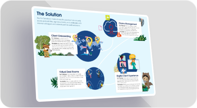 The Solution Box for Salesforce makes it easy for your teams to securely Claims Management access and edit files, sign documents, and collaborate with The Challenge: Customers and agents need to internal colleagues and external partners and customers. share videos, images, data feeds, and other associated documents related to a claim. A fragmented experience can put sensitive information at risk. The Solution: Box helps shorten the insurance claims lifecycle and simplify claim management by centralizing client and agent data in one place. Client Onboarding The Challenge: In-person account opening processes make it challenging for firms to onboard new clients quickly. The Solution: Box streamlines client onboarding by enabling clients and internal teams to securely share and access confidential information, assign tasks, sign documents, and edit content from any device, anywhere. Virtual Deal Rooms The Challenge: Complicated deal room setups result in delays in deals, confusing bidder/third-party Digital Client Experience experiences, and risk of sensitive data exposure due to the lack of audit logs. The Challenge: Clients expect a consumer experience The Solution: Box can create a centralized, secure, when working with their financial institution. When their and compliant virtual data room for sell side and buy expectations aren't met, it can cost business and lead to side deal transactions like M&A activities, private a poor brand reputation. equity, and contract negotiations. The Solution: With Box, you can drive seamless multiparty collaboration by providing clients and financial advisors with a more effective and interactive way to work with a rich set of APIs to create tailored digital experiences.