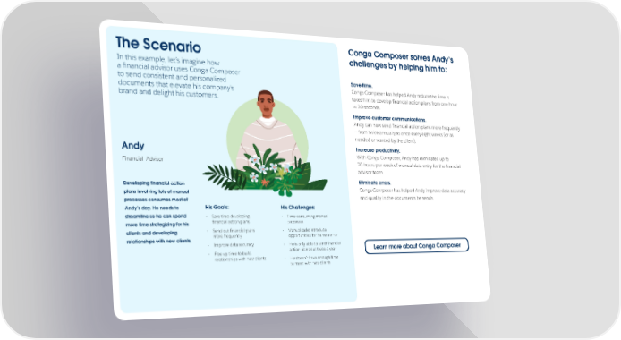 The Scenario Conga Composer solves Andy’s challenges by helping him to: In this example, let’s imagine how a financial advisor uses Conga Composer to send consistent and personalized Save time. documents that elevate his company’s Conga Composer has helped Andy reduce the time it brand and delight his customers. takes him to develop financial action plans from one hour to 30 seconds. Improve customer communications. Andy can now send financial action plans more frequently — from twice annually to once every eight weeks (or as needed or wanted by the client). Andy Increase productivity. With Conga Composer, Andy has eliminated up to Financial Advisor 20 hours per week of manual data entry for the financial advisor team. Developing financial action Eliminate errors. plans involving lots of manual Conga Composer has helped Andy improve data accuracy processes consumes most of and quality in the documents he sends. Andy’s day. He needs to His Goals: His Challenges: streamline so he can spend • Save time developing • Time-consuming manual more time strategizing for his financial action plans processes clients and developing • Send out financial plans • Manual tasks introduce relationships with new clients. more frequently opportunities for human error • Improve data accuracy • He is only able to send financial • Free up time to build action plans out twice a year Learn more about Conga Composer relationships with new clients • He doesn’t have enough time to meet with new clients