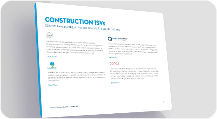 Construction ISVs ISVs that have a strong, proven use case within a specific industry Specialty Trade Contractors use BidBook to increase revenue and deliver The ComplianceQuest Environmental, Health and Safety app enables construction construction operations remotely and efficiently. With an efficient bidding platform companies to digitise their end-to-end safety process. This comprehensive, mobile- for receiving and aggregating bids, convert more projects, track project execution, first solution allows users to enter safety incident data, mitigate risks with a job safety schedule crew labour and material deliveries to job sites, and monitor job cost data. analysis, enter onsite inspections, receive just-in-time training and safety documents, Eliminate data islands and get 100% of your company on one cloud. and leverage best-practice dashboards. Learn More > Learn More > Construction companies can digitise work in Salesforce with Conga’s document, BuilderTek is a unique, custom construction and property management software for Contract Lifecycle Management (CLM) and e-signature applications. Conga impacts builders, property managers, re-modellers and general contractors, built natively on the “last mile of contracting” by leveraging the data within Salesforce to transform Salesforce. BuilderTek streamlines the core aspects of construction in one, easy-to- contracts and processes. Projects, bids, suppliers, partners, contracts, and related use application. documents are managed faster and easier, with Conga. Learn More > Learn More > EMEA ISV Industry Booklet — Construction 4