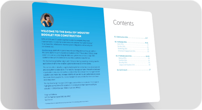 Contents WELCOME TO THE EMEA ISV INDUSTRY BOOKLET FOR CONSTRUCTION 01. Construction ISVs . . . . . . . . . . . . . . . . . . . . . . . . . . .3–7 93% of CIOs and IT Leaders say that in order to compete, they need 02. Horizontal ISVs . . . . . . . . . . . . . . . . . . . . . . . . . . . 8–21 improvements in customer experience and customer facing technology.* Sales ISVs . . . . . . . . . . . . . . . . . . . . . . . . . . . . . . . . . . . .9 To achieve this, initiatives to improve system integration and security are Service ISVs . . . . . . . . . . . . . . . . . . . . . . . . . . . . . . . . 14 considered vital. Marketing ISVs . . . . . . . . . . . . . . . . . . . . . . . . . . . . . 18 AppExchange applications speed up and ease integration as they are built on Employee Engagement ISVs . . . . . . . . . . . . . . . . . . 20 the same platform as the Salesforce Customer 360. This enables CIOs to break down silos and securely integrate data and systems to achieve a single 360 03. IT Infrastructure ISVs . . . . . . . . . . . . . . . . . . . . . 22–26 customer view and therefore drive seamless customer experiences. Backup ISVs . . . . . . . . . . . . . . . . . . . . . . . . . . . . . . . . 23 The AppExchange further aligns with CIO priorities by providing industry-specific DevOps ISVs . . . . . . . . . . . . . . . . . . . . . . . . . . . . . . . . 24 applications that further enable digital transformation in their sector. Security ISVs . . . . . . . . . . . . . . . . . . . . . . . . . . . . . . . 25 Usage and Adoption ISVs . . . . . . . . . . . . . . . . . . . . 26 The construction industry is rapidly digitising to help drive business development and ecosystem collaboration. The need to manage complex interactions between 04. Get in touch . . . . . . . . . . . . . . . . . . . . . . . . . . . . . . . . 27 organisations requires innovative solutions that help streamline management of suppliers and materials, increase visibility of operations, and automate processes to ensure timely payments, reduce budget risk and provide front end and back- end integration. The AppExchange has over 7,000 apps and certified consultants. This booklet highlights some of the ISV solutions in construction that have the ability to execute in EMEA (Europe, Middle East and Africa). Virginia Matassa VP ISV Partner Sales EMEA & APAC Salesforce *Salesforce Research analysed survey responses from 100+ technology leaders worldwide