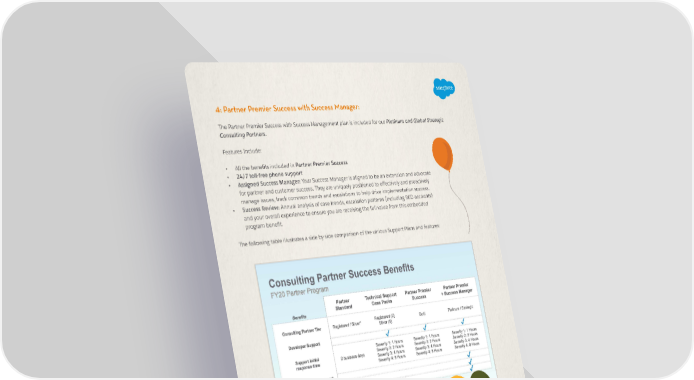 4: Partner Premier Success with Success Manager: The Partner Premier Success with Success Management plan is included for our Platinum and Global Strategic Consulting Partners. Features Include: • All the benefits included in Partner Premier Success • 24/7 toll-free phone support • Assigned Success Manager: Your Success Manager is aligned to be an extension and advocate for partner and customer success. They are uniquely positioned to effectively and proactively manage issues, track common trends and escalations to help drive implementation success. • Success Review: Annual analysis of case trends, escalation patterns (including RED accounts) and your overall experience to ensure you are receiving the full value from this embedded program benefit. The following table illustrates a side by side comparison of the various Support Plans and features: Our Developer Support is designed specifically to assist our partners with successful implementations within a wide range of technical environments and scenarios. You can find out more about developer support here.