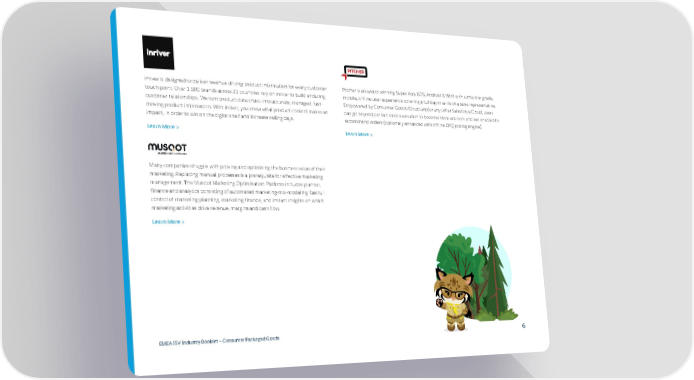 inriver is designed to deliver revenue-driving product information for every customer Pitcher is an award-winning Super App (iOS, Android & Win) with consumer grade, touch point. Over 1,500 brands across 21 countries rely on inriver to build enduring mobile, offline user experience covering a full day-in-a-life of a sales representative. customer relationships. We turn product data chaos into accurate, managed, fast- Empowered by Consumer Goods Cloud and/or any other Salesforce Cloud, users moving product information. With inriver, you know what product content makes an can go beyond perfect store execution to become store advisors and are enabled to impact, in order to win on the digital shelf and increase selling days. recommend orders (optionally enhanced with offline CPQ pricing engine). Learn More > Learn More > Many companies struggle with proving and optimising the business value of their marketing. Replacing manual processes is a prerequisite for effective marketing management. The Musqot Marketing Optimisation Platform includes planner, finance and analytics consisting of automated marketing-mix-modeling. Get full control of marketing planning, marketing finance, and instant insights on which marketing activities drive revenue, margins and cash flow. Learn More > EMEA ISV Industry Booklet — Consumer Packaged Goods 6