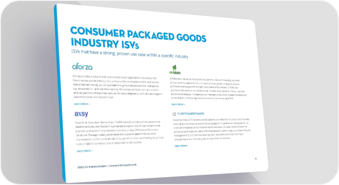 CONSUMER PACKAGED GOODS s INDUSTRY ISV ISVs that have a strong, proven use case within a specific industry Aforza provides a suite of mobile and cloud based applications that are built for CPGToolBox harnesses the Salesforce platform, the world’s leading customer the consumer goods industry. Our products offer a complete end-to-end solution and account management tool, to help consumer goods companies achieve that enhances the way you do business through embedded artificial intelligence, profitable revenue growth through trade spend effectiveness. CPGToolBox big data analytics, and machine learning. Aforza has significant pricing functions provides trade promotion solutions that increase trade spend efficiency, optimise and can perform offline order capture. Aforza is designed to work with and support promotion strategies, increase account manager productivity, streamline deduction Salesforce Consumer Goods Cloud. reconciliation, and leverage the value of data to achieve a rapid ROI. Learn More > Learn More > Axsy Retail Execution Mobile App is 100% Salesforce-native and is powered by Customertimes (CT) provides native Salesforce mobile and cloud solutions that help Salesforce Consumer Goods Cloud standard objects. It is offline-first and cross medical and commercial reps to better engage with stakeholders. Designed for life platform and works in any network condition, on any iOS/Android/Windows sciences companies and consumer health use cases, our applications streamline 10 device. The app is easily extendable and supports Salesforce’s no-code processes and empower teams with standard and custom objects, contract lifecycle customisation tools such as Mobile Flow, plus it is further extended by Axsy’s own management (CLM), remote detailing, retail execution and order tracking to suite of Salesforce-native customisation tools and solutions. dramatically boost efficiency and increase their bottom line. Learn More > Learn More > EMEA ISV Industry Booklet — Consumer Packaged Goods 4