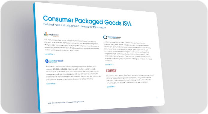 Consumer Packaged Goods ISVs ISVs that have a strong, proven use case for the industry CPG manufacturers have a lot to manage and tend to suffer most from staffing A comprehensive integrated tool for Consumer-Packaged Goods firms to shortages. With Rootstock manufacturing cloud ERP on a next-generation platform, implement, manage and enhance workplace safety and compliance by seamlessly all of your data - from inventory availability to quality compliance to landed costs - is connecting all quality, health, safety, and environment workflow and data. Changing accessible by anyone from anywhere. This keeps auditors happy and makes it easier consumer demands, shrinking operating margins, global supplier network, and to identify continuous improvement opportunities. the necessity to meet international compliance and regulations are forcing CPG companies to improve efficiency, reduce costs while mitigating operational risk Learn More > and managing Nonconformances. Companies must adapt their value chains to be responsive to the shifting needs of consumers and the global market, and to manage compliance. Learn More > StoreConnect is a Salesforce-native, completely integrated, multi-store, multi- currency, B2B, B2C and B2B2C, eCommerce 3.0 platform providing a single source of truth for all related store and customer data. Use StoreConnect’s stock management tooling or integrate directly with your ERP. Easily launch stores for multiple brands in multiple regions and currencies. Remove data silos and integrate CPG manufacturers adopting workflow management for revenue operations depend your customer experience and backend systems to increase efficiency. on Conga to accurately configure and quote products. Conga’s revenue lifecycle management solutions power the supply chain so products can be delivered on Learn More > time, on budget, and on schedule to help operate at maximum efficiency. Learn More > APAC ISV Industry Booklet — Consumer Packaged Goods 4