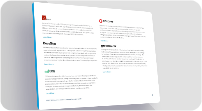 Vigience Overcast provides 100+ prepackaged integrations with SAP ERP “as-a- Sitecore is the leading provider of end-to-end digital experience software. Unifying Service”. The synchronous and asynchronous interfaces span data processes and data, content, commerce, and experiences, our SaaS-enabled, composable UI layers to seamlessly connect business processes across Salesforce and SAP. platform empowers organizations to deliver unforgettable interactions across every Ready-to-use, extendable solution bundles exist for Customer 360, quote & order touchpoint. Our solution provides the cutting-edge tools brands need to build management, consumer goods cloud and B2C/B2B commerce. stronger connections with customers while creating content efficiencies to stand out as transformation and innovation leaders. Learn More > Learn More > Efficient and cost-effective contracting is key to the supply chains which underpin CPG Marketplacer is equipped with all the tools and functionality needed to quickly organizations, both large and small. DocuSign and Salesforce help CPG organizations build successful and scalable online marketplaces. Marketplacer has a cartridge with distributed teams to get agreements completed seamlessly, with many reducing for Salesforce Commerce Cloud available in the Salesforce AppExchange. The contract drafting and completion times by over 50%. DocuSign and Salesforce are Marketplacer solution helps retailers increase customer purchase frequency central to delivering smarter contracting solutions which not only save time and by catering to the diverse needs of consumers - as well as their basket size - by resources in contracting but also deliver a better, more efficient employee experience. introducing new, related items which have a substantial trickle-down impact on net Learn More > revenue. With Marketplacer, retailers create a seamless customer experience by offering related products around the retailer’s vertical and expanding product lines unavailable via competitors. Learn More > CPGvision harnesses the Salesforce platform, the world’s leading customer and account management tool, to help consumer goods companies achieve profitable revenue growth through trade spend effectiveness. CPGvision provides trade promotion solutions that increase trade spend efficiency, optimise promotion strategies, increase account manager productivity, streamline deduction reconciliation, and leverage the value of data to achieve a rapid ROI. Learn More > APAC ISV Industry Booklet — Consumer Packaged Goods 5