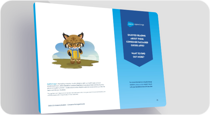 Enjoyed reading about these Consumer Packaged Goods apps? Want to find out more? AppExchange is the leading enterprise cloud marketplace with over 4,400 ready-to-install For more information on AppExchange solutions and over 1,800 consultants to extend Salesforce in any department and industry. It’s a solutions, drop us a line or get in touch proven ecosystem with 8M+ installs and more than 90,000 customer reviews to help you find the with your Salesforce Account Executive best match for your business. The apps featured in these booklets have been selected based on their strong use cases in the selected industries, and an EMEA presence with in-region support for our customers. EMEA ISV Industry Booklet – Consumer Packaged Goods 212121